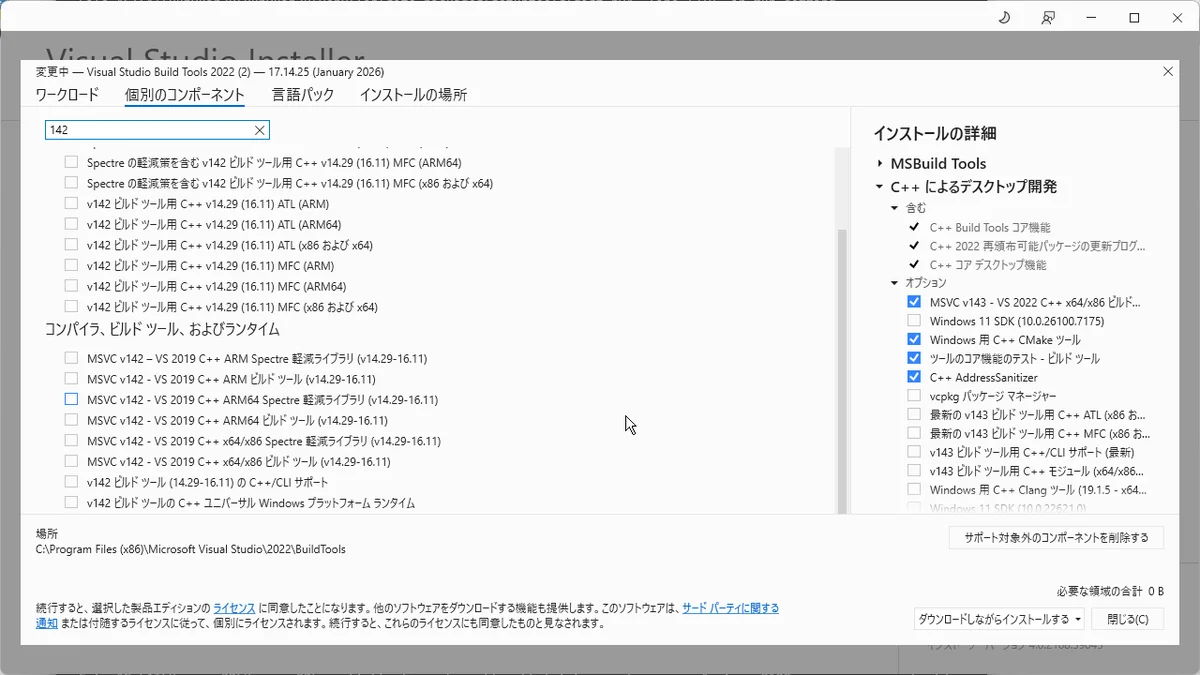 → MSVC 14.44 以上を必ず入れる。