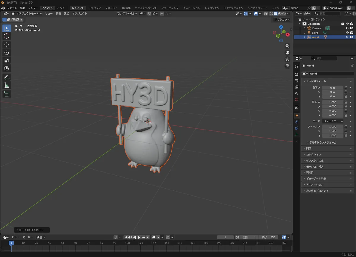生成した「demo.glb」をBlenderで読み込んだスクショ: