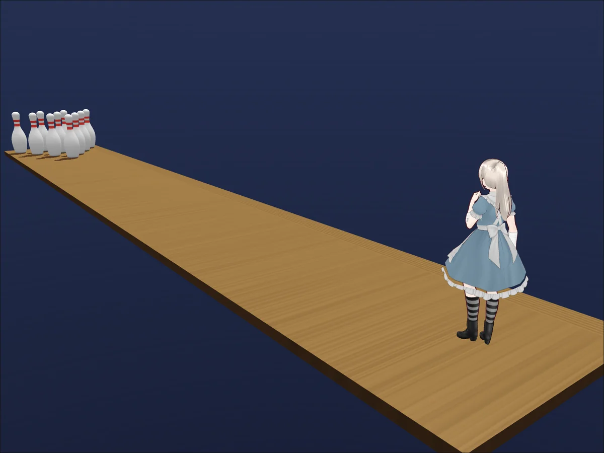 今回は「ボウリングとして最低限“遊べる”」ところまでを最短で作ることを目的に、Havok物理・GLBピン差し替え・左右移動・長押し投球・PMX+VPDポーズ適用までを一気に通しました。 特に、ピンを 見た目(GLB)と物理(円柱)で分離したことで挙動が安定し、操作や演出に作業時間を回せたのが大きいです。影・空・木目を入れた段階で、試作でも画として成立するところまで到達できました。