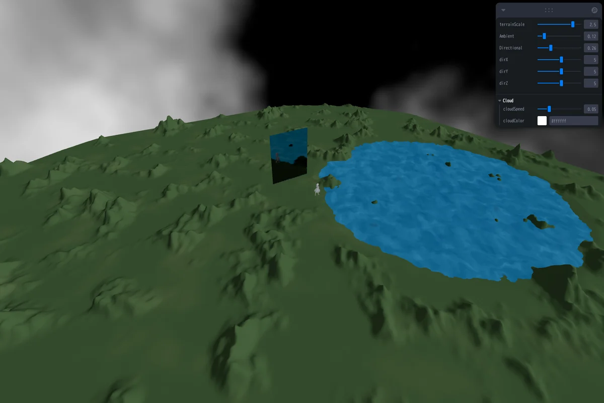 [Next.js #11] FBM地形を削って“動く湖”を作る:反射・雲ドーム・水シェーダーの完全統合