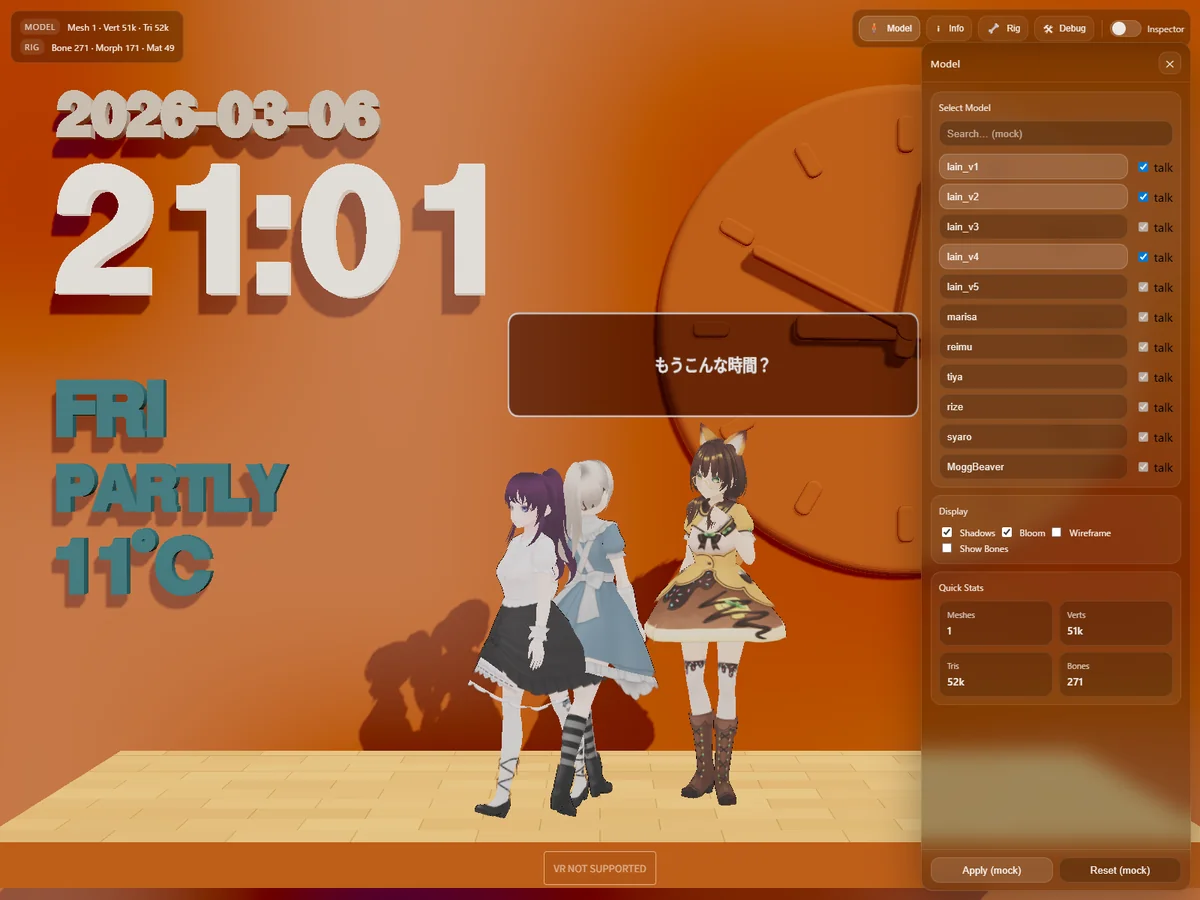 今回は、MMD の複数モデル表示に対応し、actor ベースで各モデルを管理できるようにしました。あわせて、モデル追加 / 削除 UI、talk トグル、複数キャラを1人ずつ順番に喋らせる制御も整理しています。▼主な更新内容 - 複数MMDモデル表示 - actorごとの MMDAnimationHelper 分...