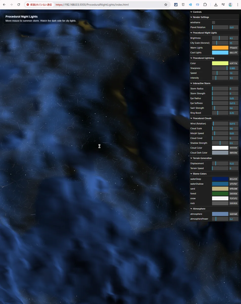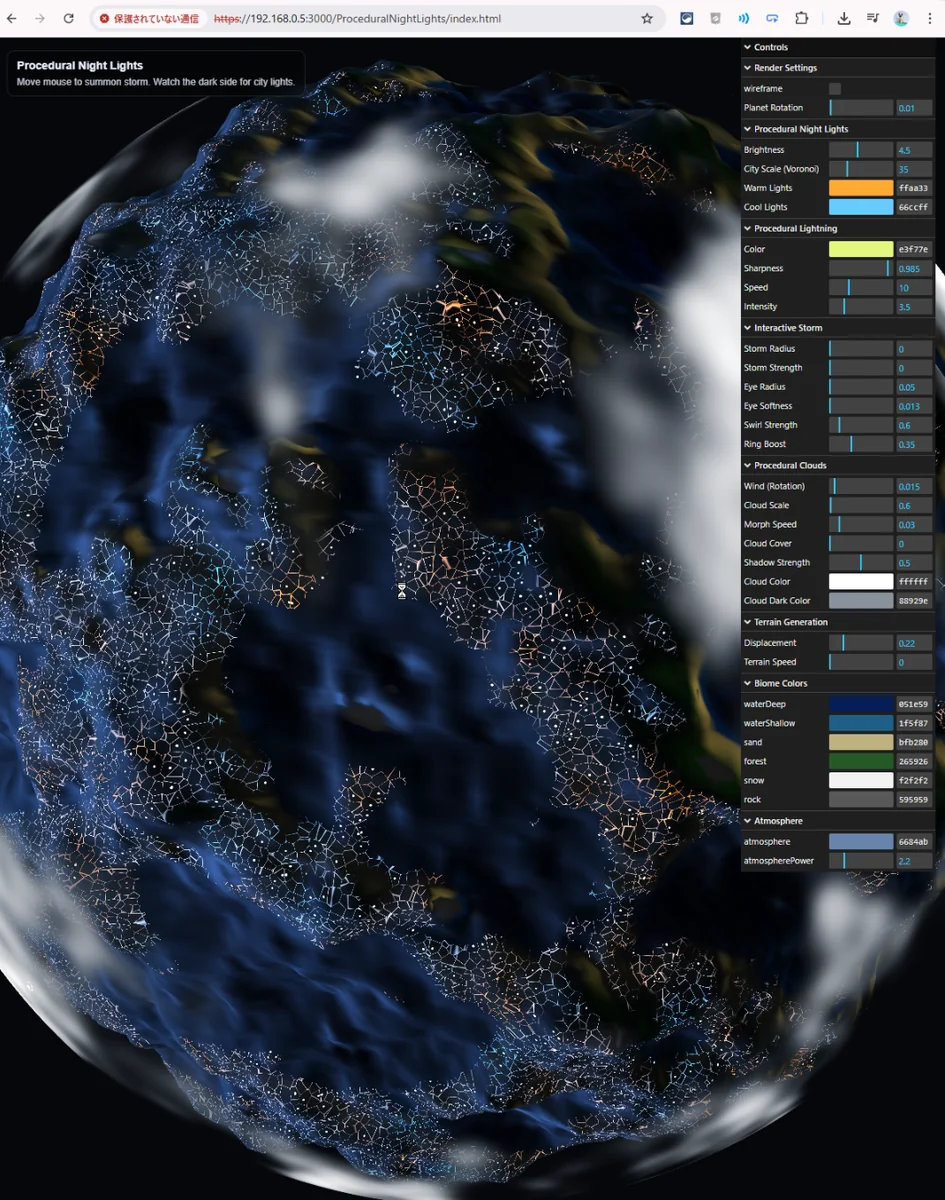前回の Storm Planet では、球体地形・雲球・雷の発光演出を組み合わせることで、「荒れた気候を持つ惑星」の表現を作りました。 雲が流れ、雷が走り、昼側だけでも十分に表情はありましたが、惑星として見た時にまだ足りないものがありました。夜の顔です。