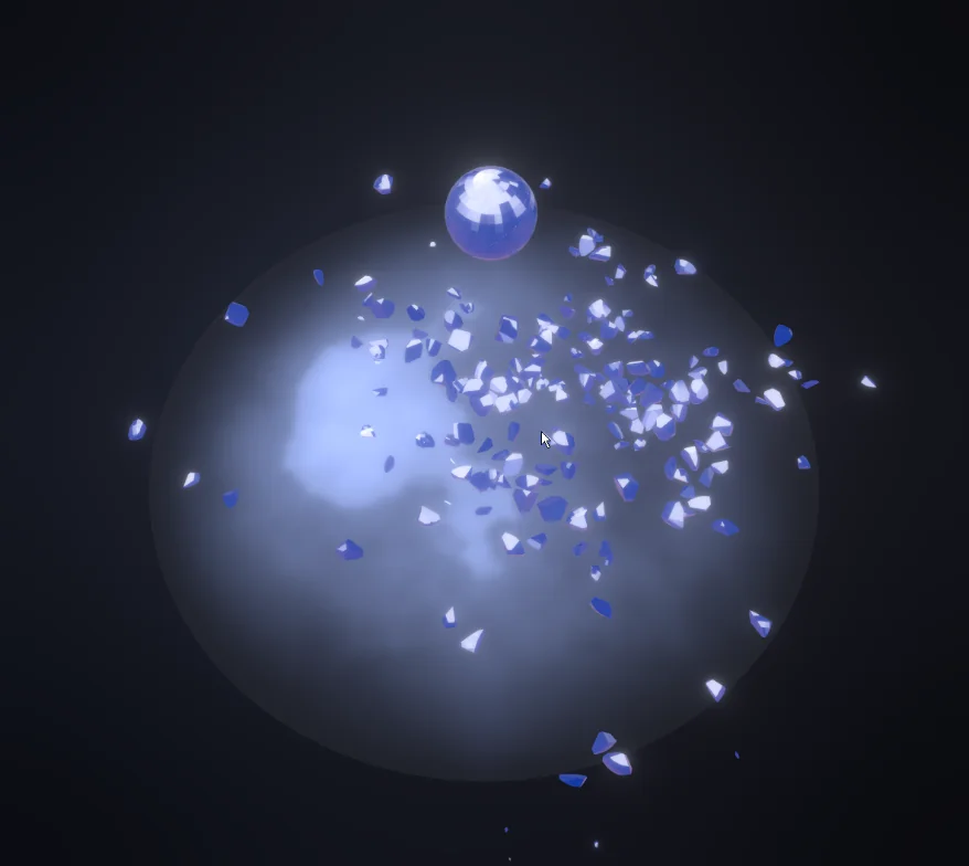 さらにドラマチックな演出として、「地面に激突して砕けた瞬間にだけ、破片が青く発光する」ギミックを入れます。
