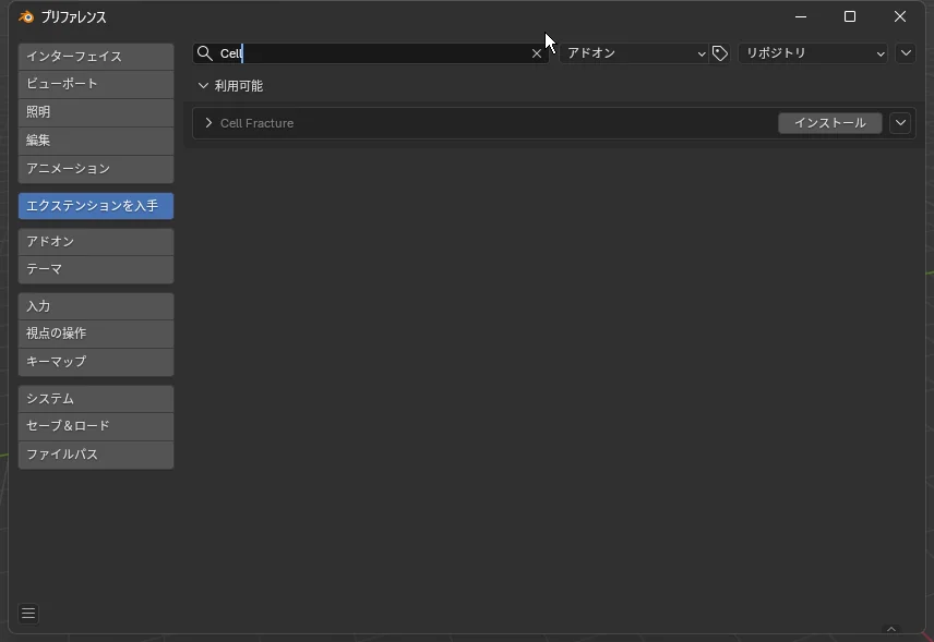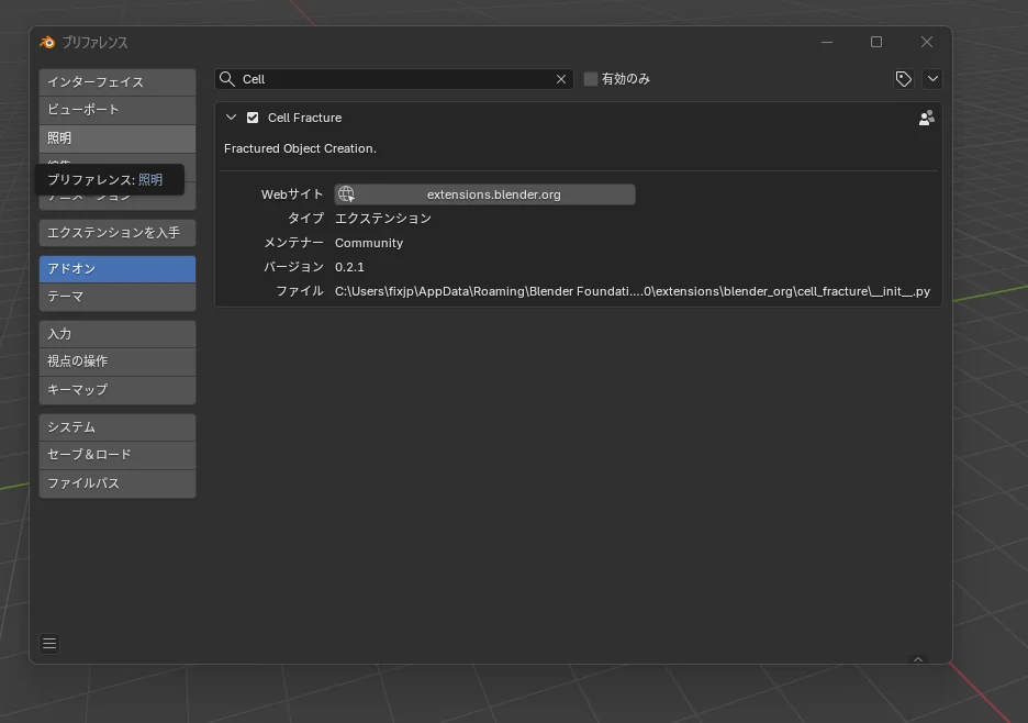 - アドオンの有効化: 上部メニューの “編集” > “プリファレンス” > “アドオン” を開き、検索バーに「Cell」と入力します。 リストに出てくる “Object: Cell Fracture” のチェックボックスをオンにします。