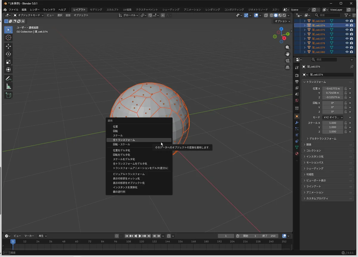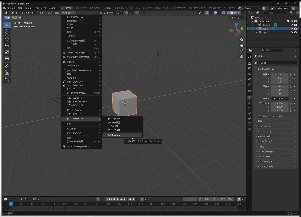 - 分割の実行: 作成したUV球を選択した状態で、上部メニューの “オブジェクト” > “クイックエフェクト” > “Cell Fracture” をクリックします。
