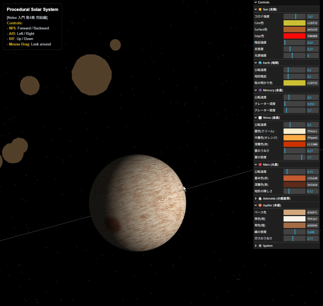 - インスペクターの統合: lil-guiを用いて、全惑星の色、雲のうねり、公転速度、軌道ラインの表示ON/OFFなどをリアルタイムで調整できるコントロールパネルを完備しました。