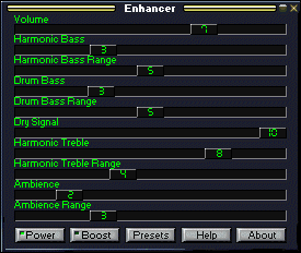 Enhancer gives you deep bass, crystal treble, nice ambience, good auto volume controller and a special volume boost technique. I hope you'll like it :)