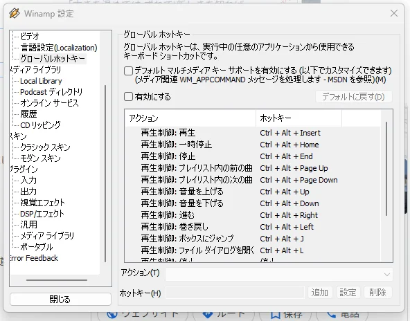 Winamp には標準で「グローバルホットキー」機能が組み込まれていて、追加プラグインを入れなくても 設定 → 全般設定 → グローバルホットキー から有効化/割り当てできます。