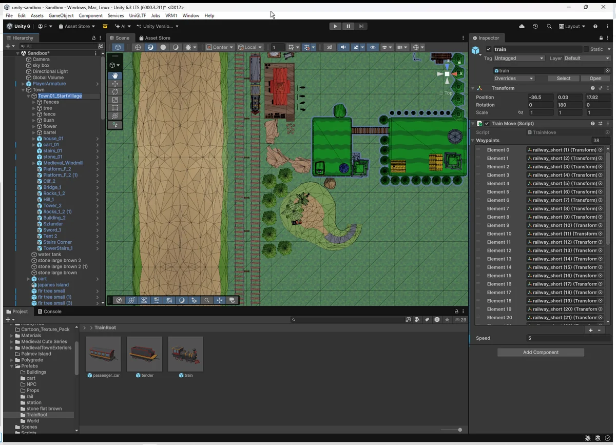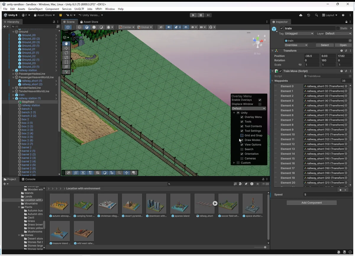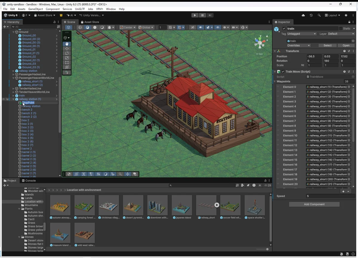 レールだけでなく、列車、駅、地形など 複数オブジェクトを階層ごと整理する場面では必須のテクニックで、 Unityの “エディタが持つ強さ” を理解した瞬間だった。