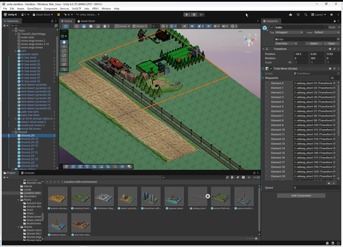 レール敷設と並行して、地形(Ground)と街(Town)のフォルダ構造を整理し始めた。 ここは Three.js とはまったく違う考え方が必要で、Unityらしい “Scene階層で世界を管理する” 感覚が少しずつ身についてきた。