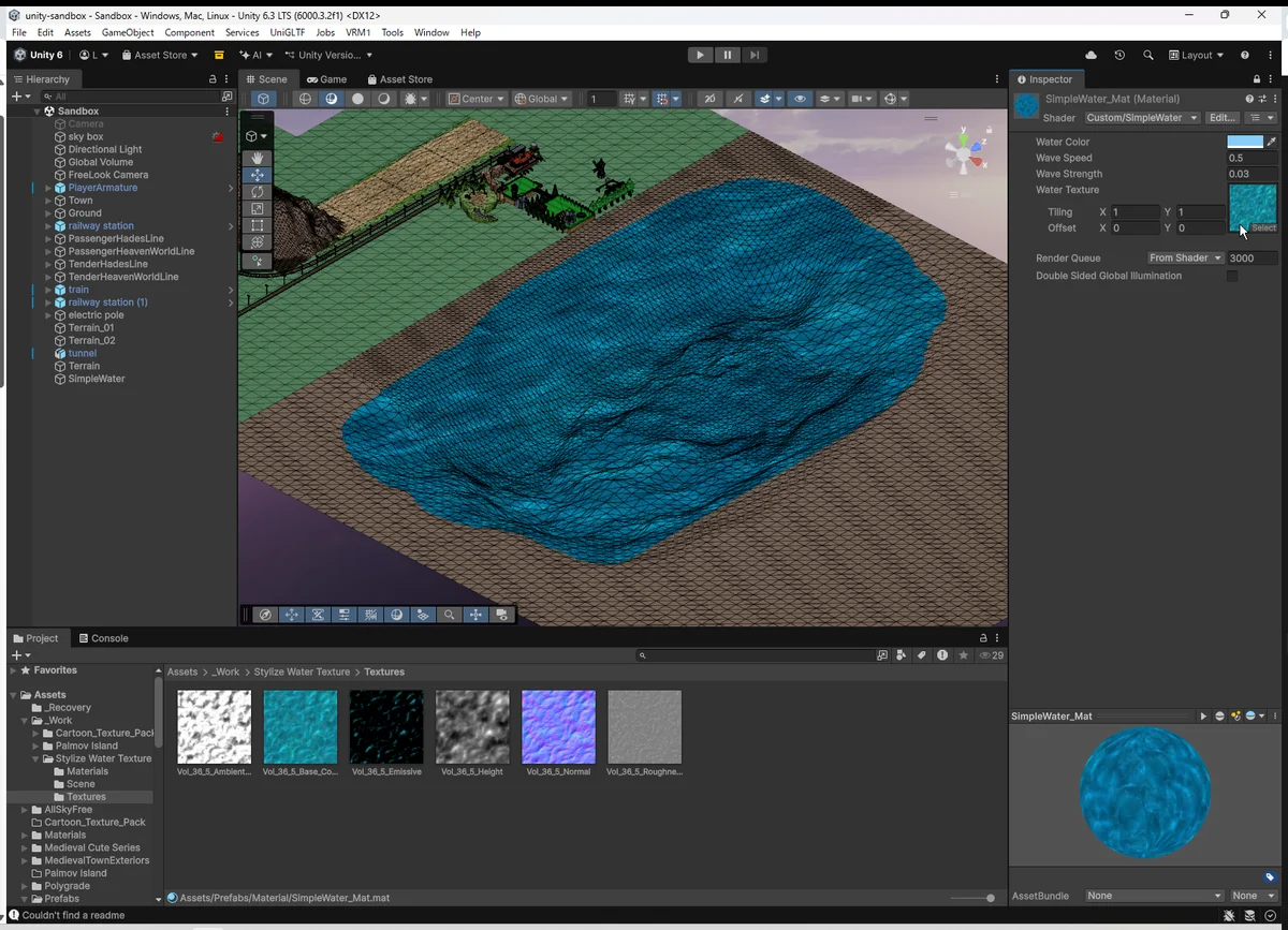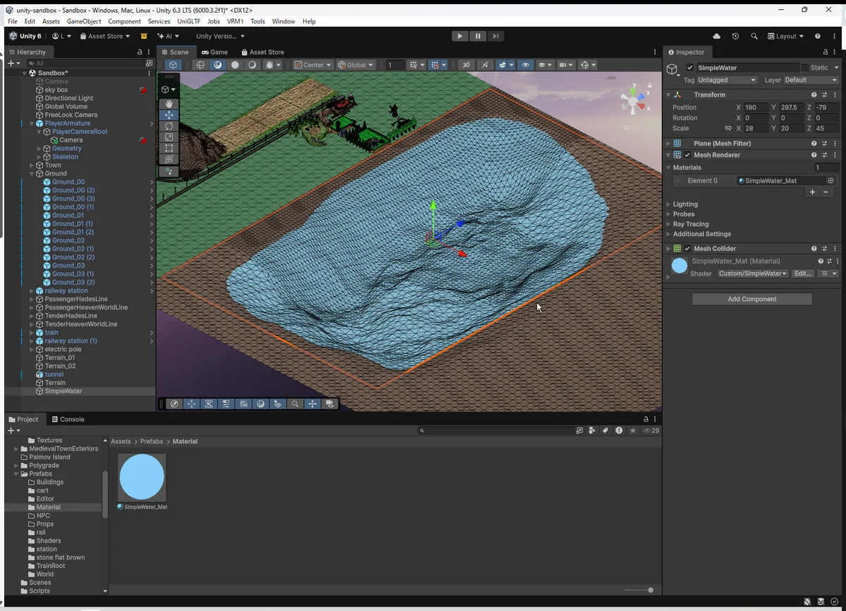 今回の SimpleWater は “最小構成の水面” だが、 Plane+自作シェーダー+テクスチャ の組み合わせだけで 箱庭の景観が一段階アップするのを実感できた。