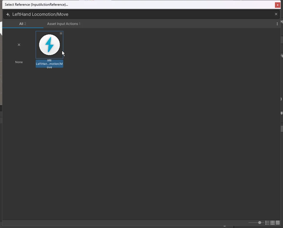 - 右側の欄(None)から XRI LeftHand Locomotion/Move を選択します。